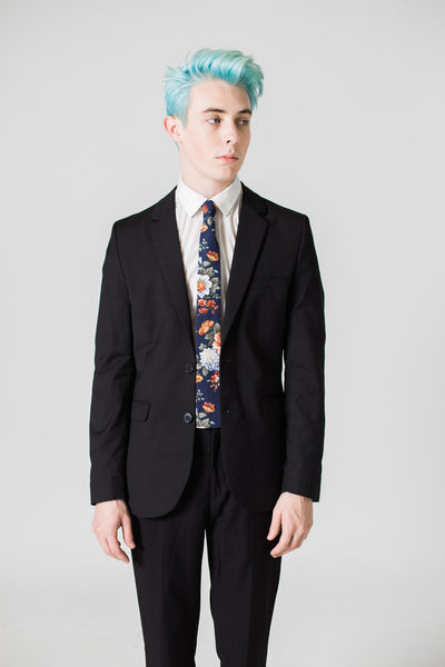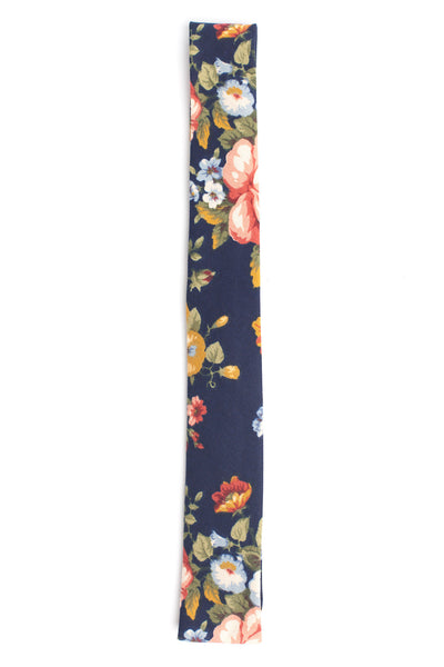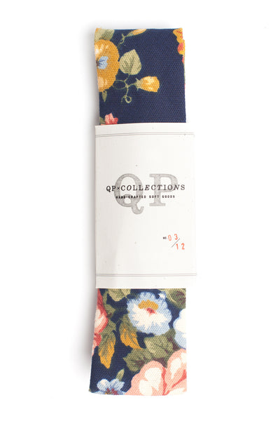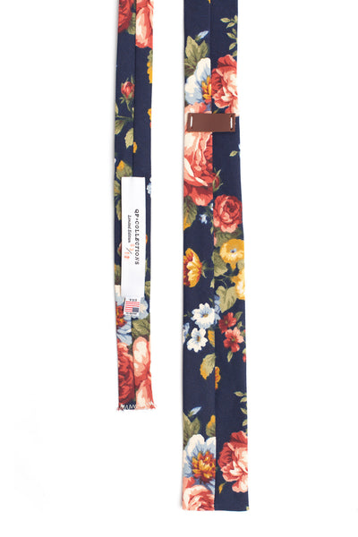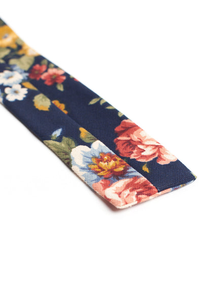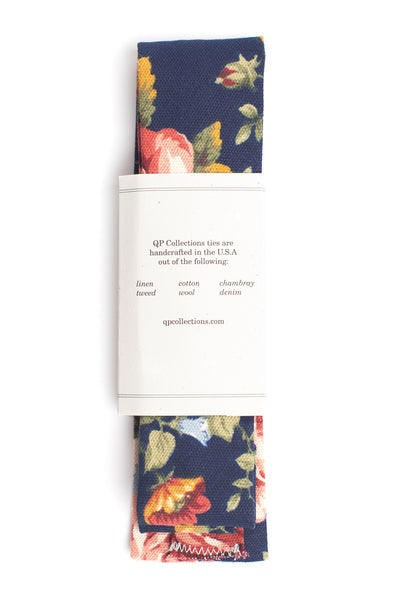 It is made of a blue cotton canvas with a large floral print. Each tie is slightly different because of the large print.